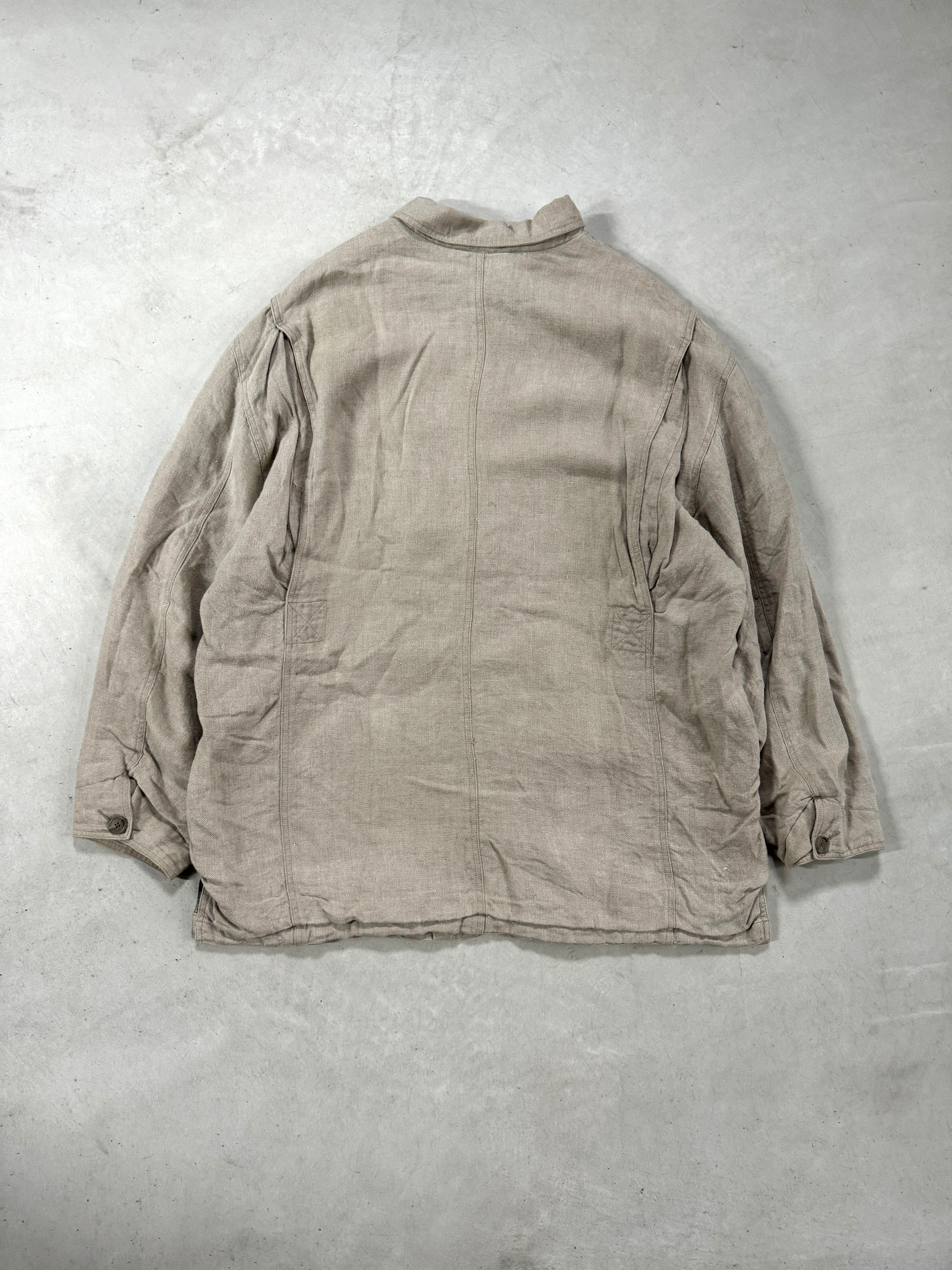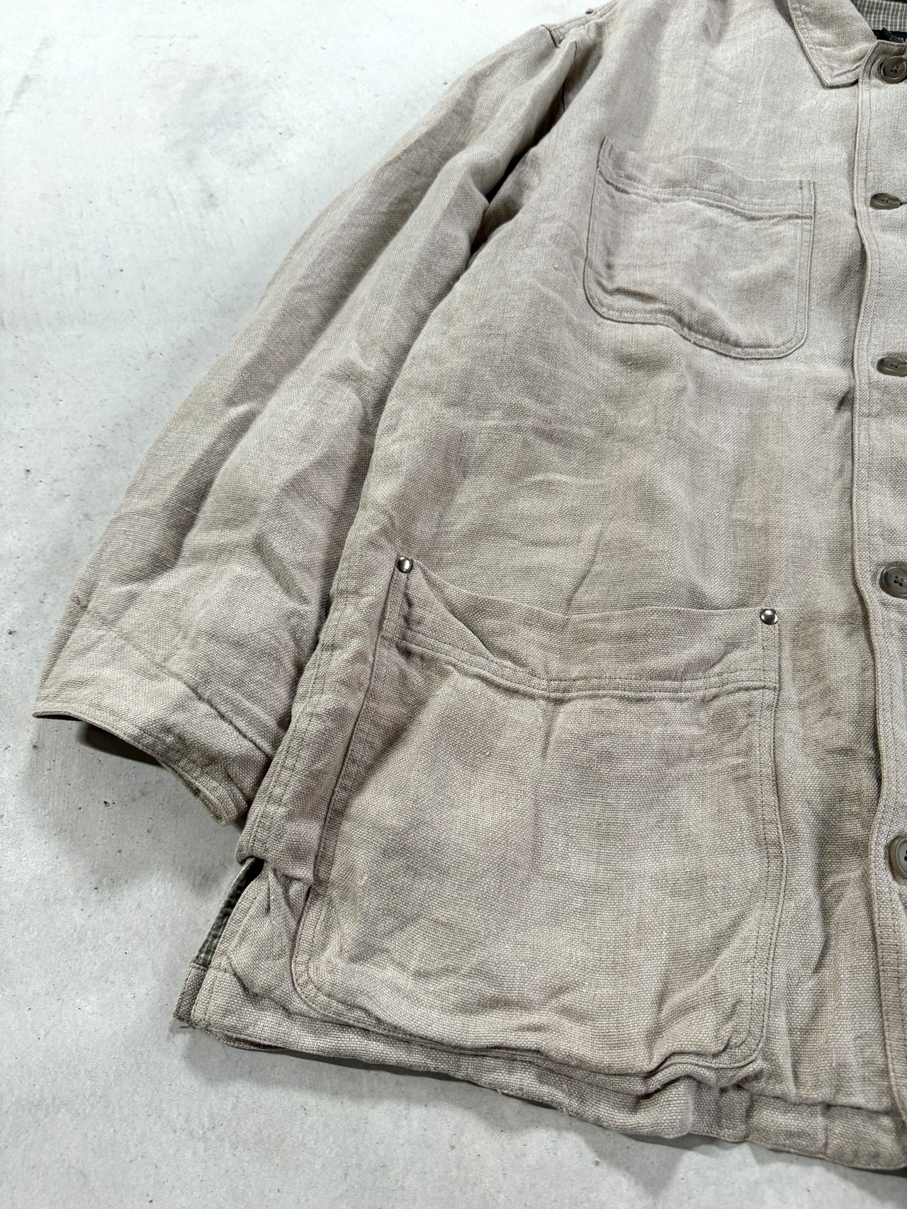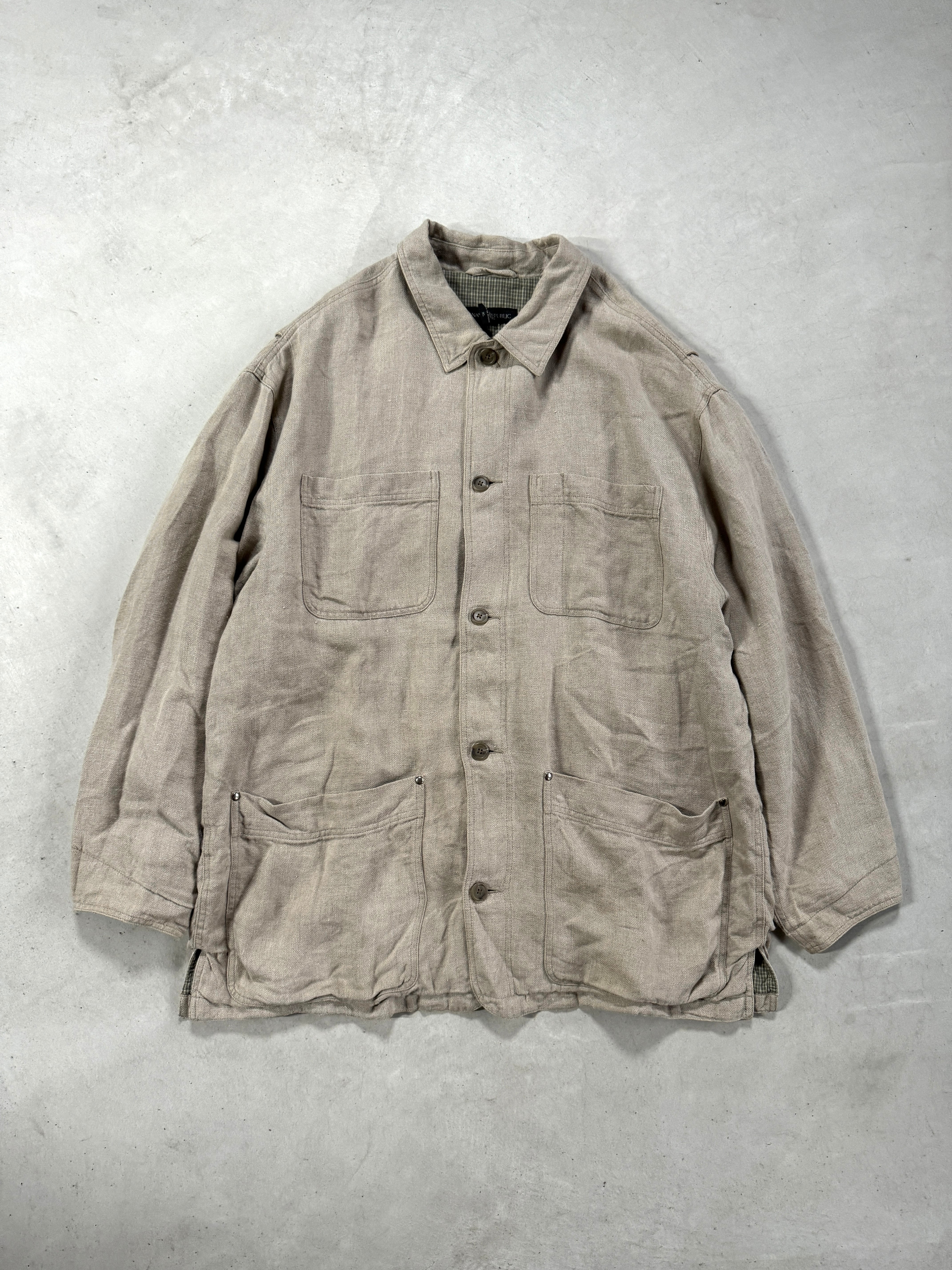 洗いざらされたヘビーオンスなリネン生地はまさに唯一無二な風合いで、それに加えて表地との縮率の違いでいい感じのシワ感がでたガンクラブチェック裏地付きというパーフェクトなジャケットです。