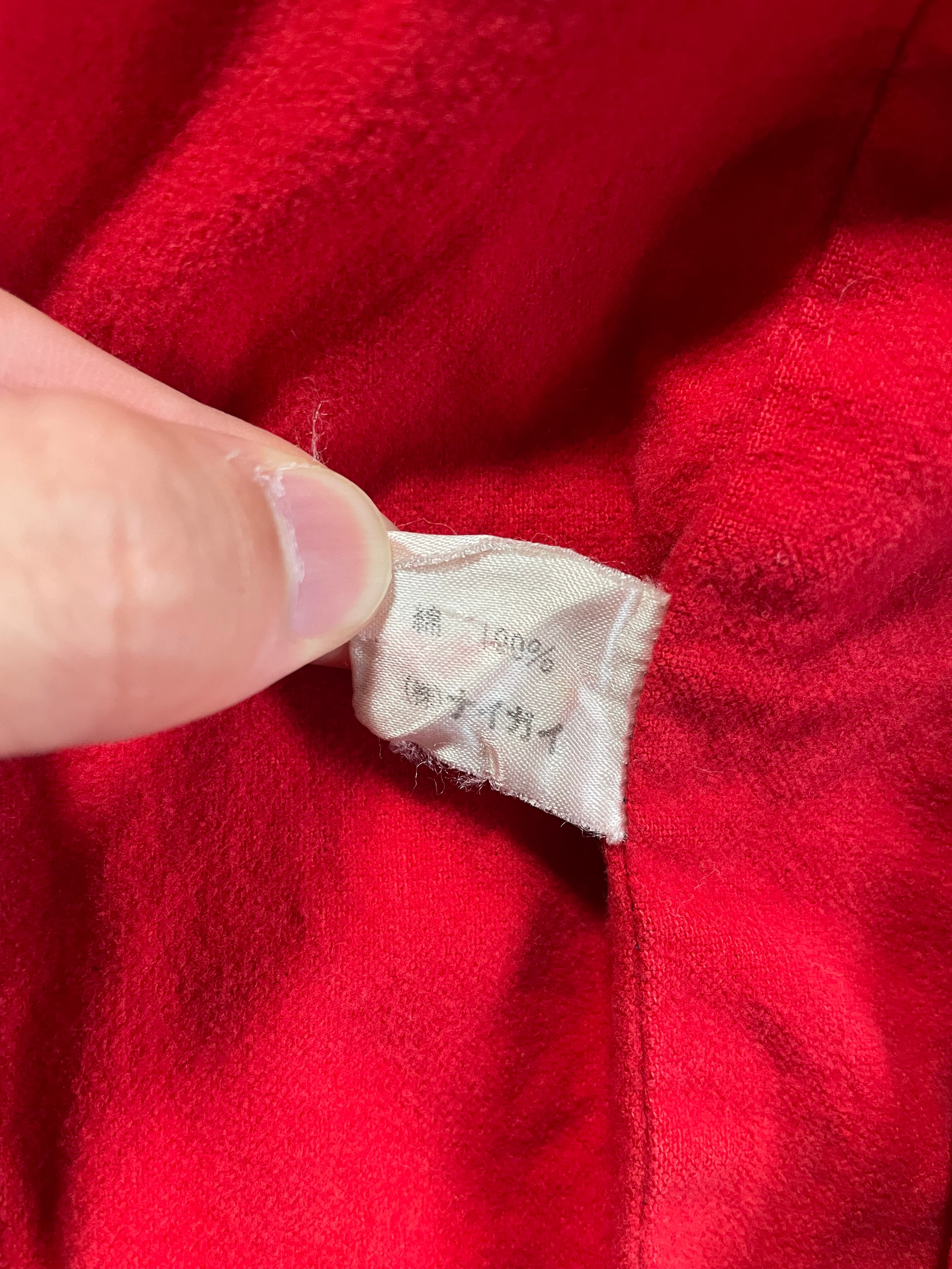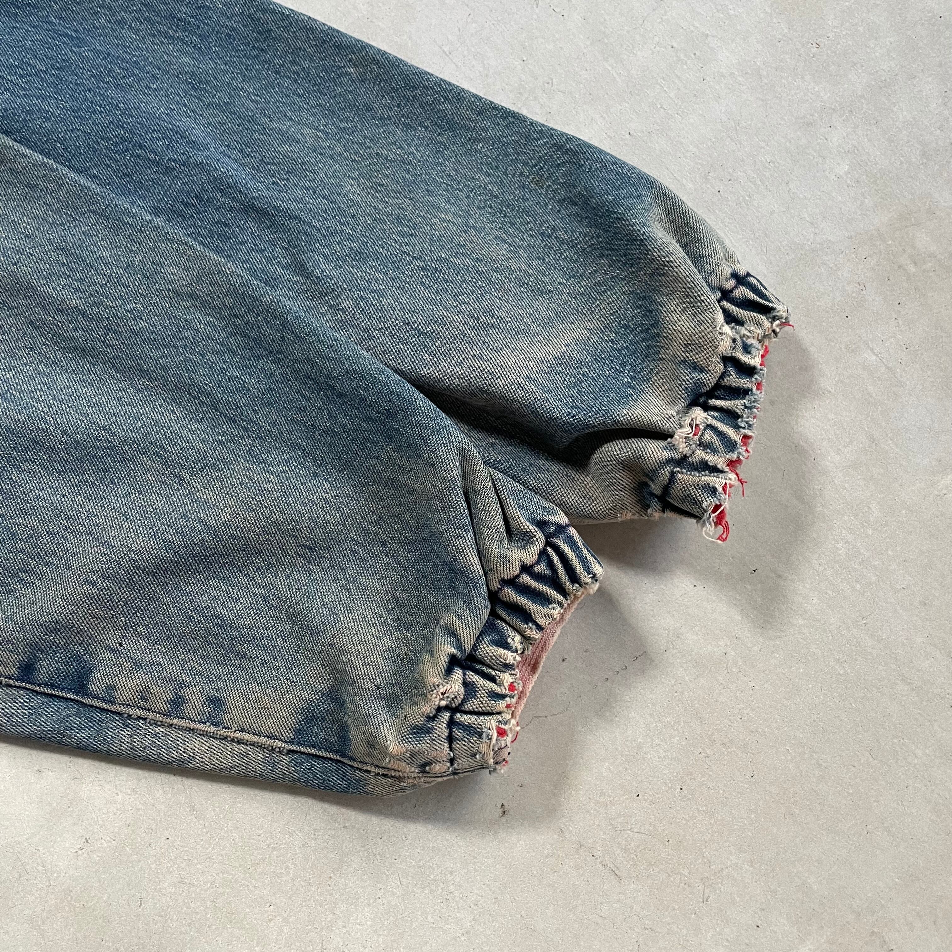 チンストラップ付、裏地のビビットな赤に加え、デニムのフェード感も良い感じになっています。袖口のリブにダメージがありますが、それも良い味になっています。